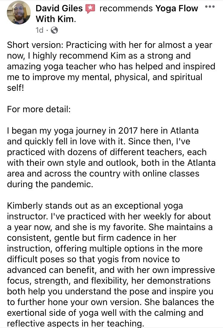 “Thanks to Kim I’ve been introduced to all kinds of different yoga classes and sessions. It’s safe to say that all the little unique nuances used in other classes have all rolled into one with her yoga fire class. She lives and breathes this ancient art, and it shows. Whether you are looking for enlightenment, better health, or just trying to alleviate lower back pain … You’ve come to the right place!”